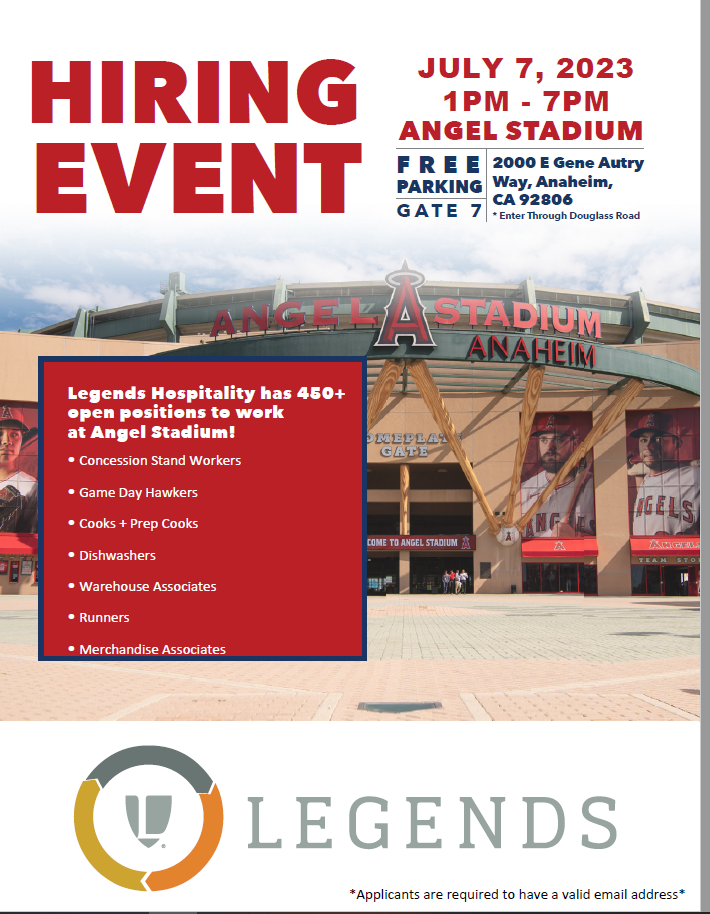 Legends Hospitality has 450+ open positions to work at Angel Stadium! • Concession Stand Workers • Game Day Hawkers • Cooks + Prep Cooks • Dishwashers • Warehouse Associates • Runners • Merchandise Associates HIRING EVENT F R E E PARKING GAT E 7 ANGEL STADIUM 2000 E Gene Autry Way, Anaheim, CA 92806 * Enter Through Douglass Road JULY 7, 2023 1PM - 7PM *Applicants are required to have a valid email address*